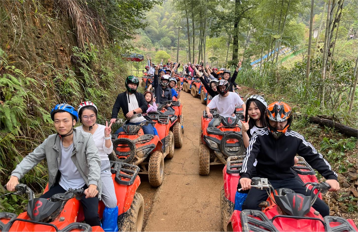 两人一车,我们戴上头盔,经过教练的安全讲解和耐心指导,终于开始体验山地越野的速度与激情。每一个陡坡、每一个转角都似乎在诉说着大自然的神秘和挑战,我们的笑声和呼喊声回荡在山谷之间。