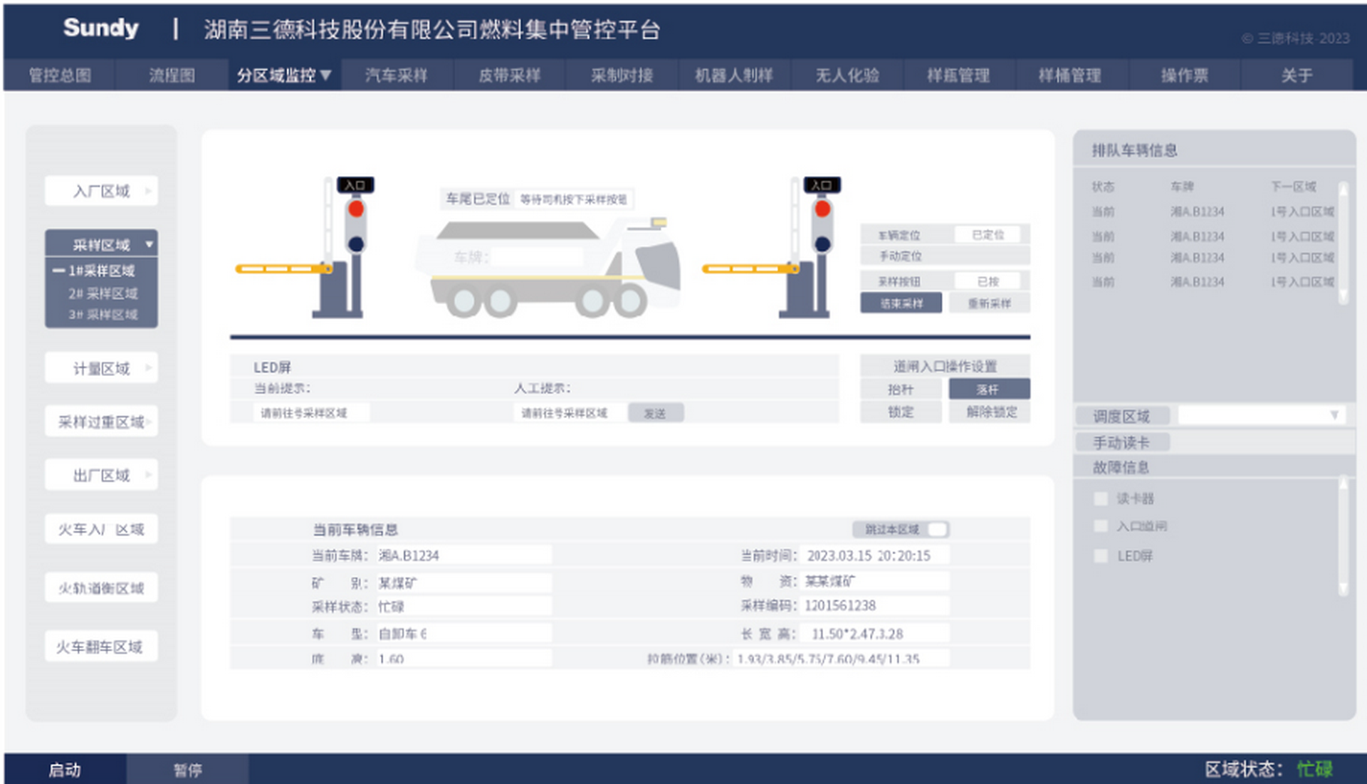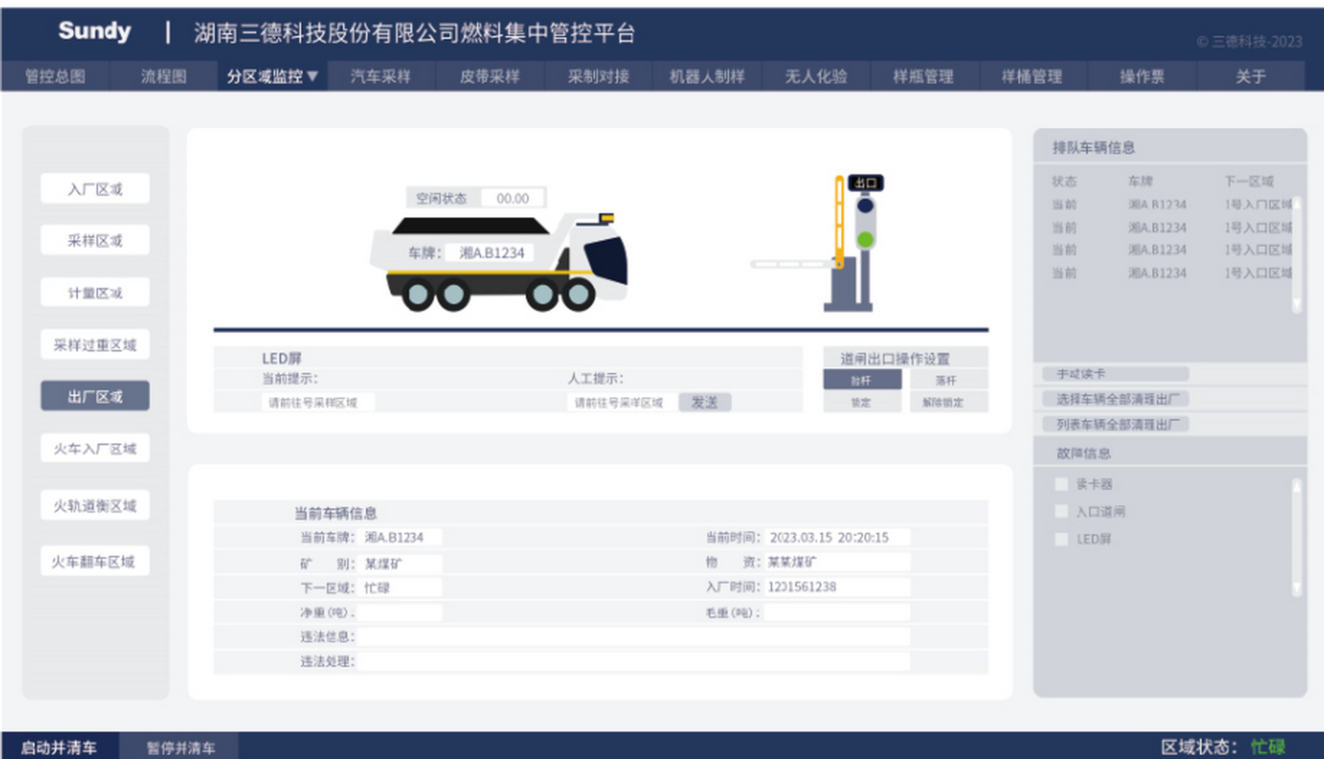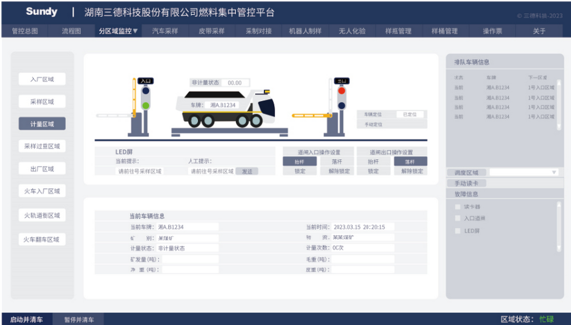 系统通过一系列的车辆通行管控设备、数字化指引标牌以及集成采样设备、计量设备的自动化控制,设计了来煤车辆从入厂至出厂的全流程智能调度、路线自动规划、自动采样、自动计量、卸煤监管、过磅单自动打印盖章等功能。完全实现了汽车煤验收现场无人监管、设备运行无人值守、提升验收效率和质量管控的目标。